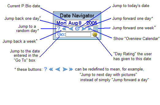 The Date Navigator shows the current P.Bio date and is also used to move from date to date. You can jump forward or back by a day or week, to a random date, or to today's date by clicking on various buttons. To jump to a specific date, enter it in the "Go To" box and hit Enter. Clicking on the Calendar button pops up the overview calendar (next page). Right-click on the Date Navigator to assign a "rating" to the current day. Right-clicking will also enable you to redefine the meaning of some Date Navigator buttons. |